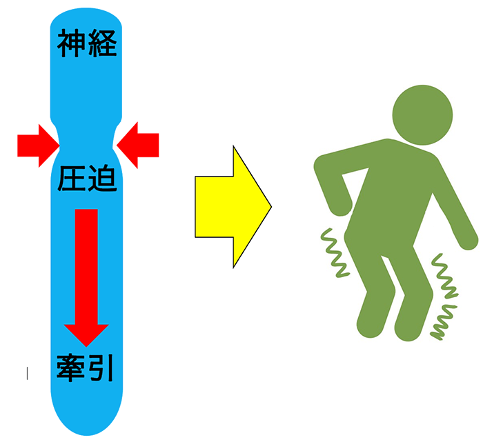 しびれが起きるためには神経の圧迫に加えて、筋膜の歪みによって神経が引っ張られるという二つのことが同時に起きる必要があるのです。